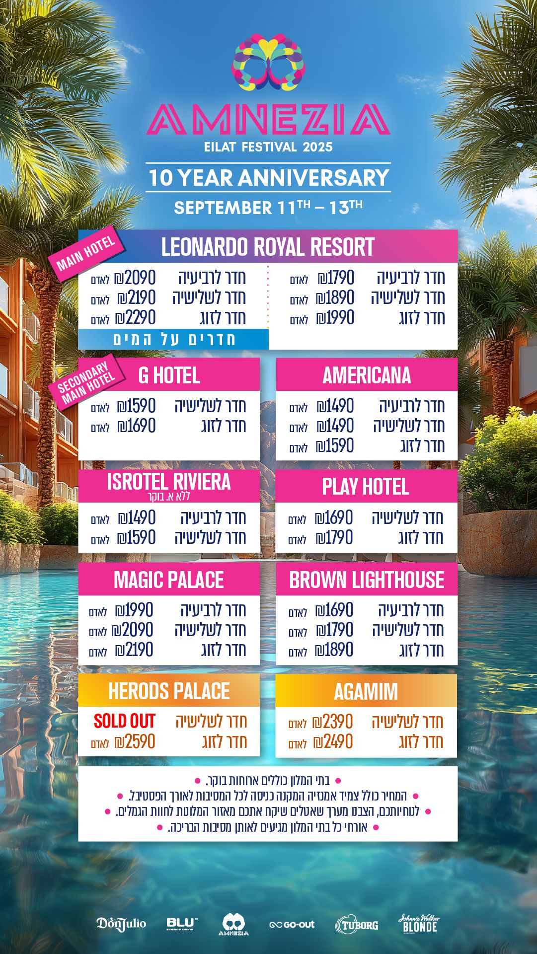כל המלונות כוללים צמיד המקנה כניסה לכל מסיבות ההפקה, ארוחת בוקר וכמובן לינה (2 לילות, 3 ימים). יחד עם זאת ניתן גם לרכוש אך ורק צמידי כניסה למסיבות ותעריפם משתנה בהתאם לכמות הימים בהם תרצו להשתתף. ניתן להזמין צמיד כניסה למסיבות כל הסופ"ש בעלות 999 ₪ או לחילופין צמיד המאפשר כניסה למסיבות שישי-שבת בעלות של 849 ₪ בלבד. האופציות הנ"ל מתאימות עבור משתתפים שלא מעוניינים בלינה עבור פסטיבל אמנזיה 2025.